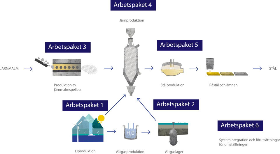 HYBRIT:s forskningsprogram omfattade olika arbetspaket. Nedan kan du läsa mer om de olika delarna inom forskningen på väg mot en fossilfri järn- och stålproduktion.